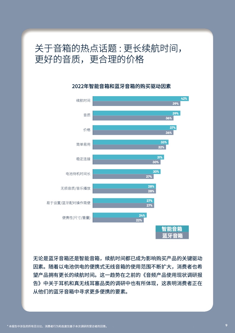 无论是蓝牙音箱还是智能音箱,续航时间都已成为影响购买产品的关键驱动因素。以电池为供电方式的便携式无线音箱使用场景仍在不断扩展,当消费者在户外等场景使用时,续航时间成为其所考虑的关键因素之一。此外,便携性也在使用场景的扩展下成为消费者的重要考量因素之一。