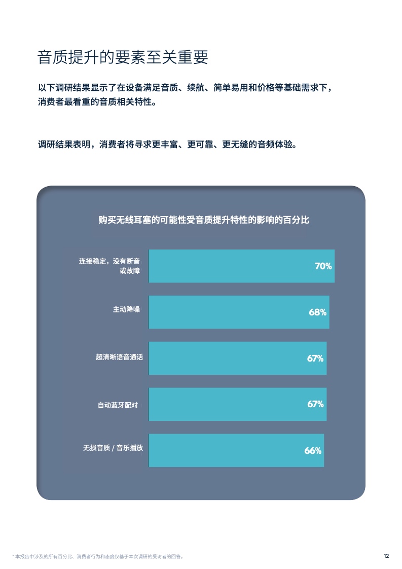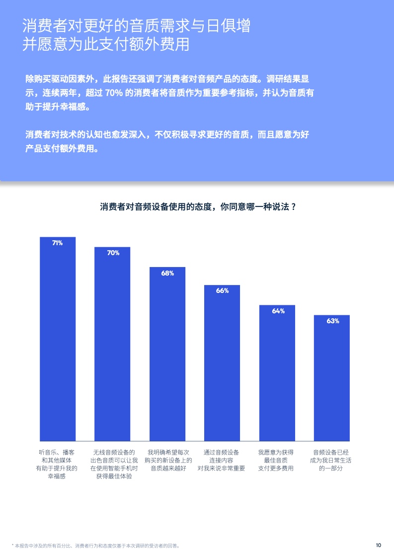 对于音频设备来说,音质仍是影响购买最为关键的因素之一。在被问及无线音频设备优先考虑的音质等级时,接近三分之二的受访者期望购买的音频产品拥有超过MP3品质的音质。