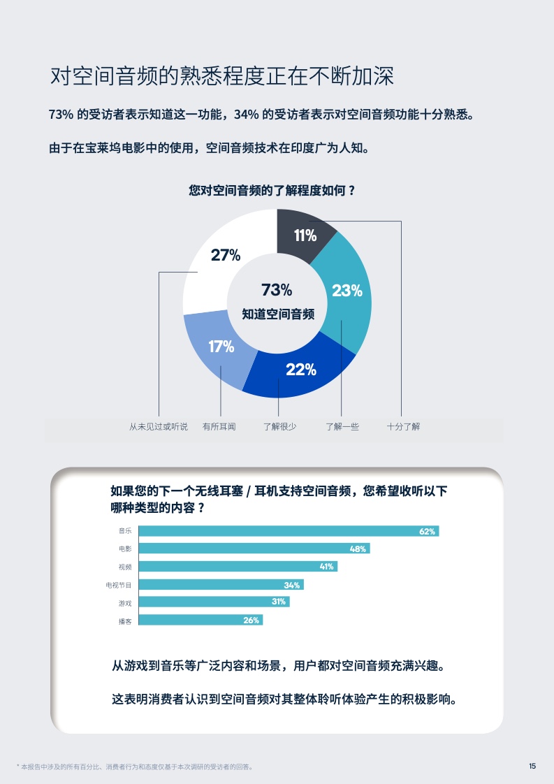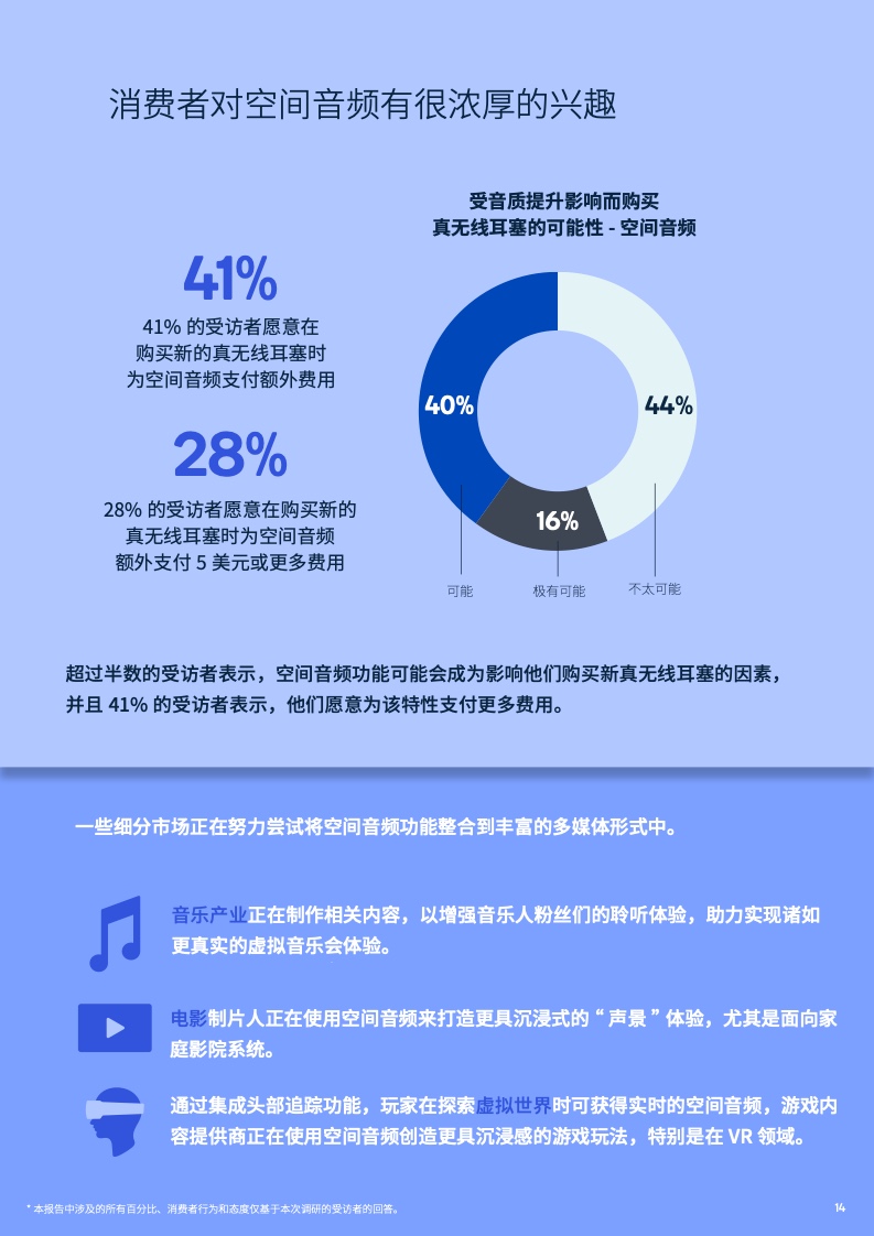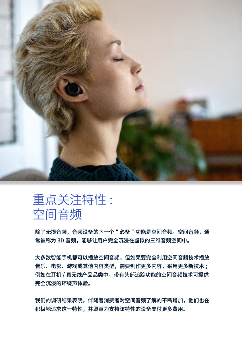 空间音频,通常被称为3D音频,能够让用户完全沉浸在虚拟的三维音频空间中。本次调研报告显示,越来越多的消费者正积极追求音频产品中的空间音频特性,并愿意为此支付更多费用。
