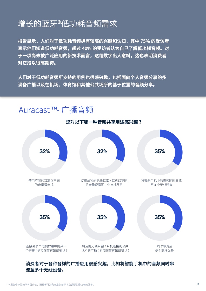 据报告显示,越来越多的用户对于低功耗音频及其所支持的场景案例抱有较高兴趣及期待,包括面向个人音频分享的多设备广播及在机场、体育馆和其他公共场所的基于位置的音频分享。