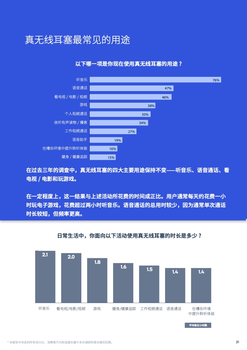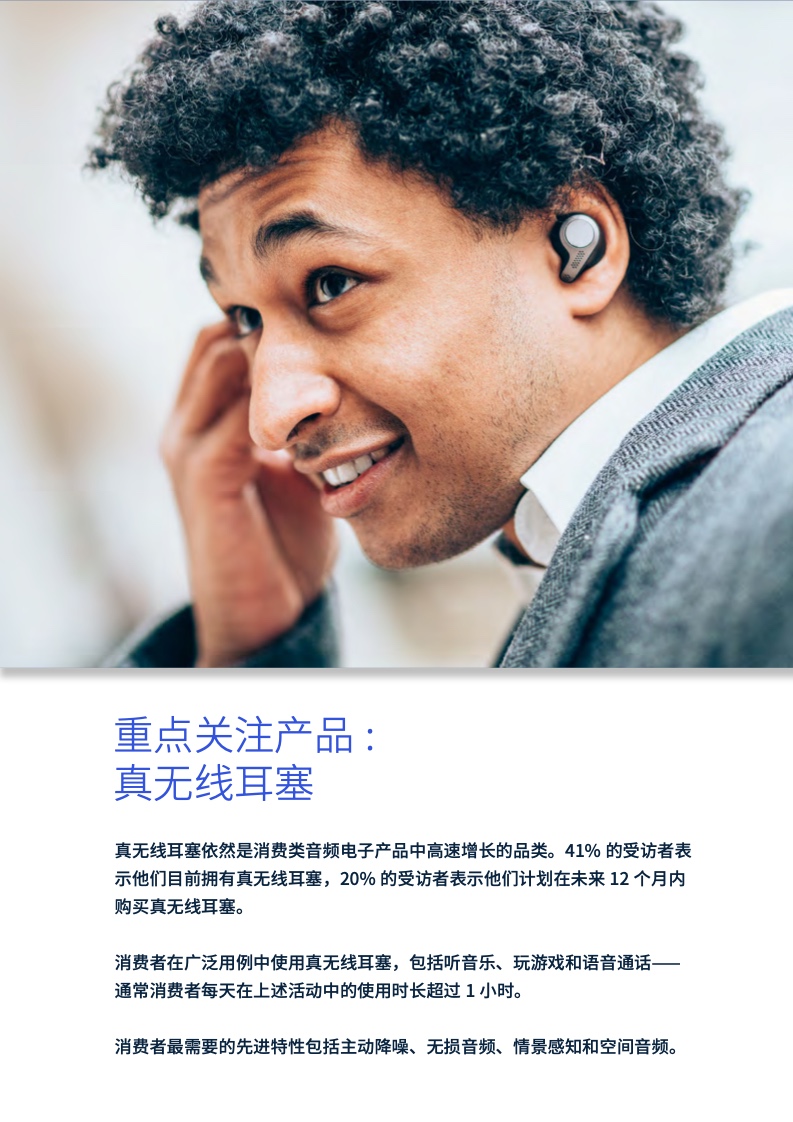 在报告中,41%的受访者表示他们目前拥有真无线耳机,20%的受访者表示他们计划在未来12个月内购买真无线耳机。而在消费者使用真无线耳机的用例中,听音乐、玩游戏及语音通话等活动在每日使用时长方面均超过1小时。