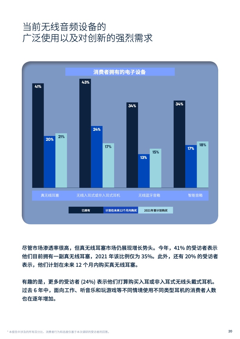 尽管无线蓝牙音箱、智能音箱等在市场认可度方面的不断提升,但真无线耳塞市场仍不断增长。在今年的调查中,41%的受访者表示他们目前拥有一副真无线耳塞,在2021年该比例仅为35%,并有20%的受访者表示,将在未来12个月内购买真无线耳塞。