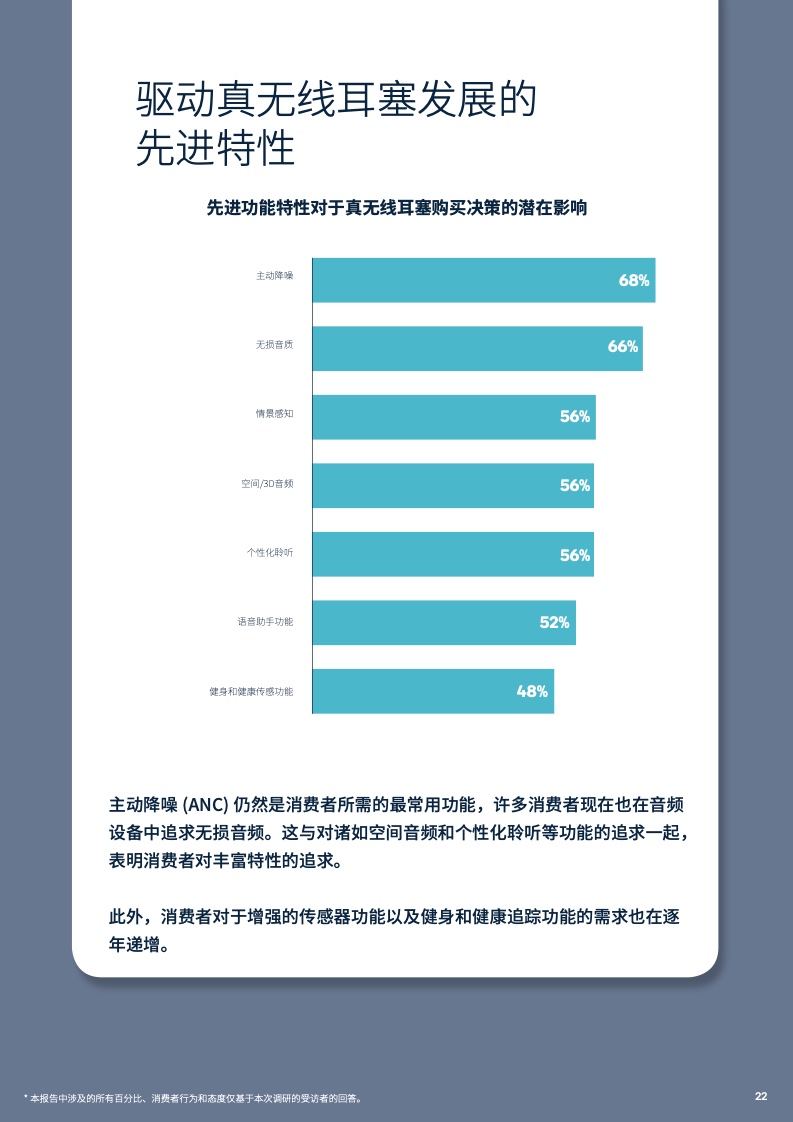 在先进功能特性方面,主动降噪(ANC)的效果仍是消费者做出购买真无线耳塞决策的首要考虑因素,而无损音质、个性化聆听、语音助手等功能的需求,也表明消费者对丰富特性的渴望。