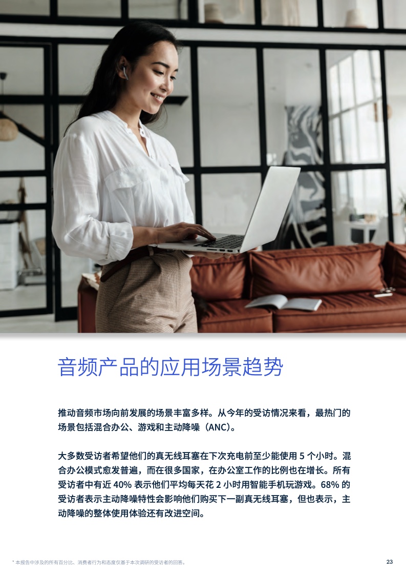 推动音频市场向前发展的场景丰富多样。从今年的受访情况来看,最热门的场景包括混合办公、游戏和主动降噪(ANC)。