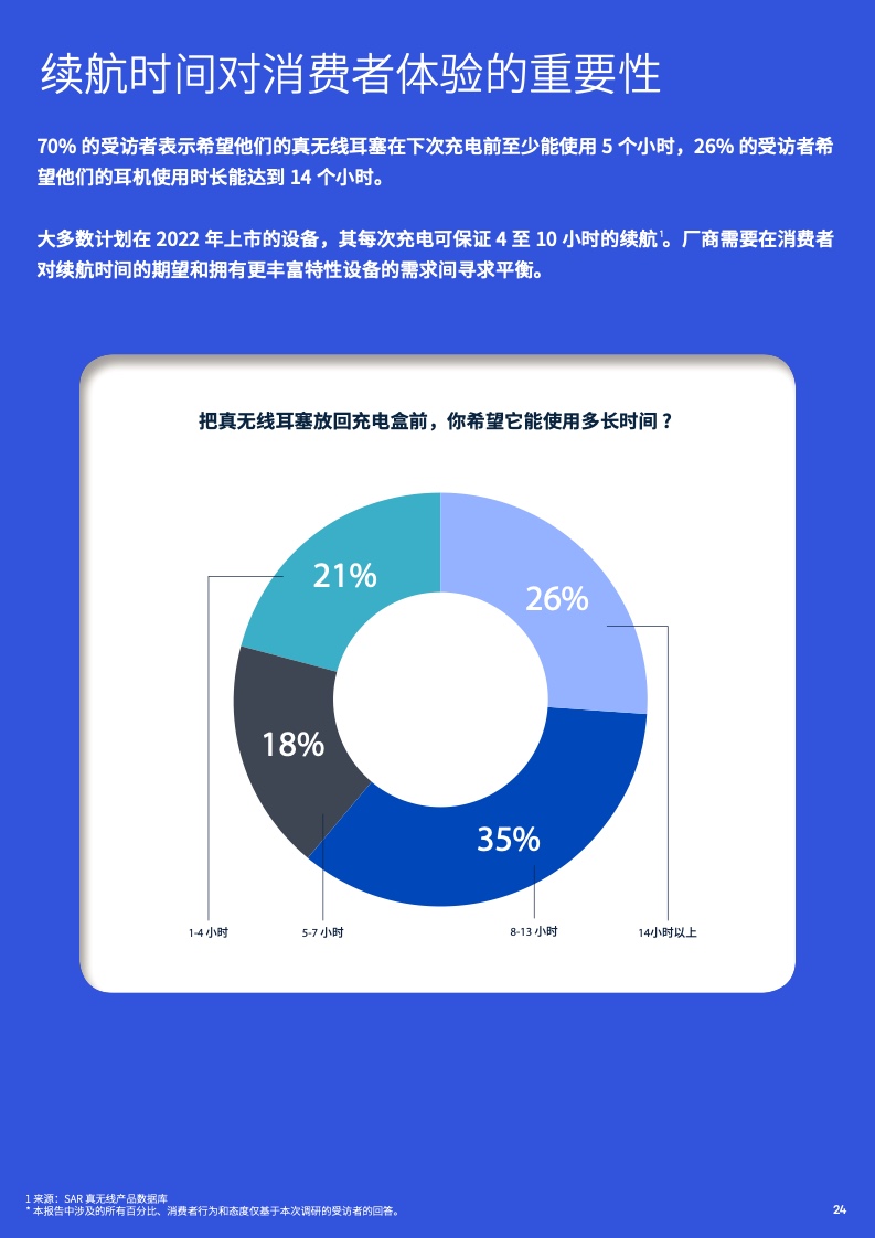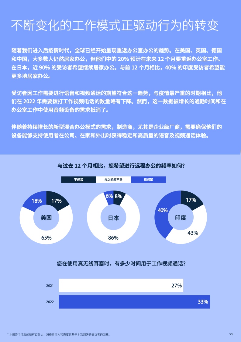 大多数受访者希望他们的真无线耳塞在下次充电前至少能使用5个小时。混合办公模式愈发普遍,在很多国家,在办公室工作的比例也在增长。