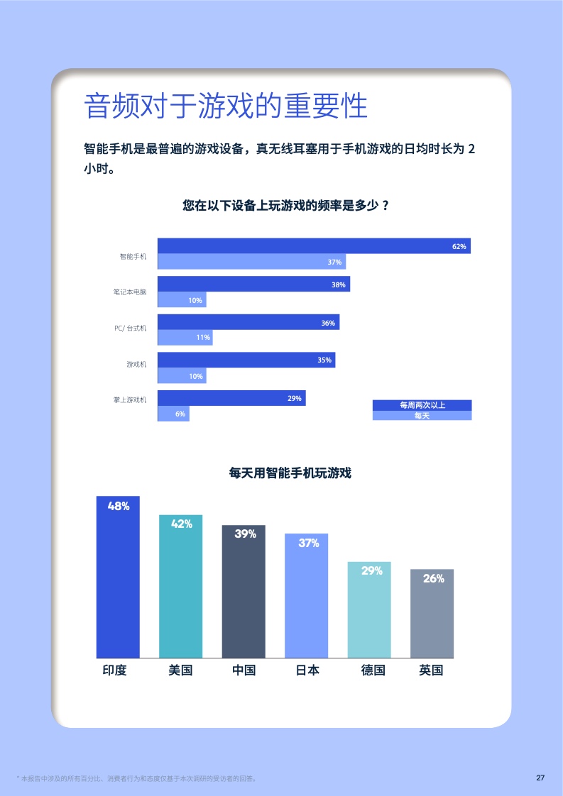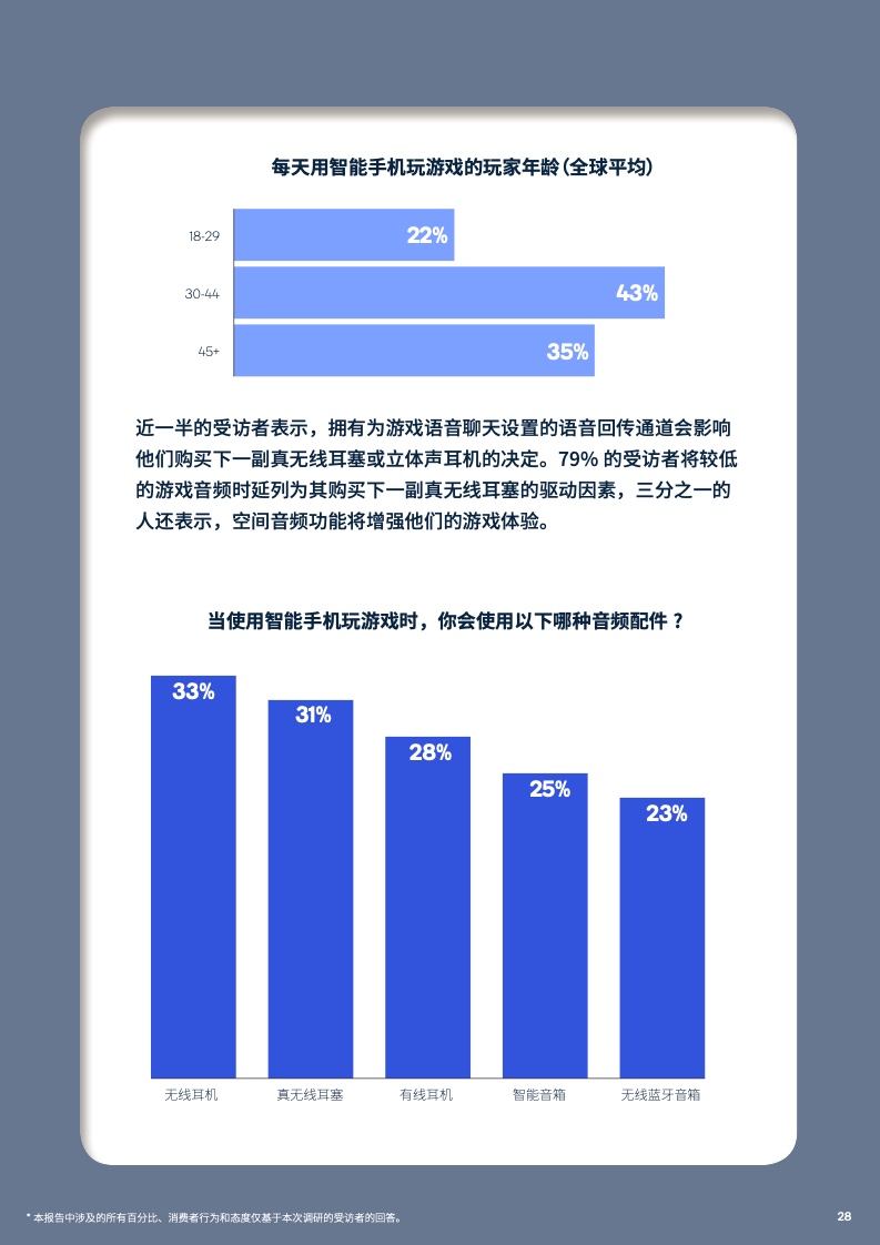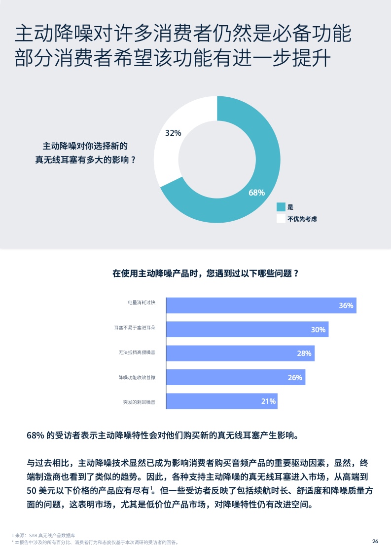 所以受访者中有近40%表示他们平均每天花2小时用智能手机玩游戏。68%的受访者表示主动降噪特性会影响他们购买下一副真无线耳塞,但也表示,主动降噪的整体使用体验还有改进空间。