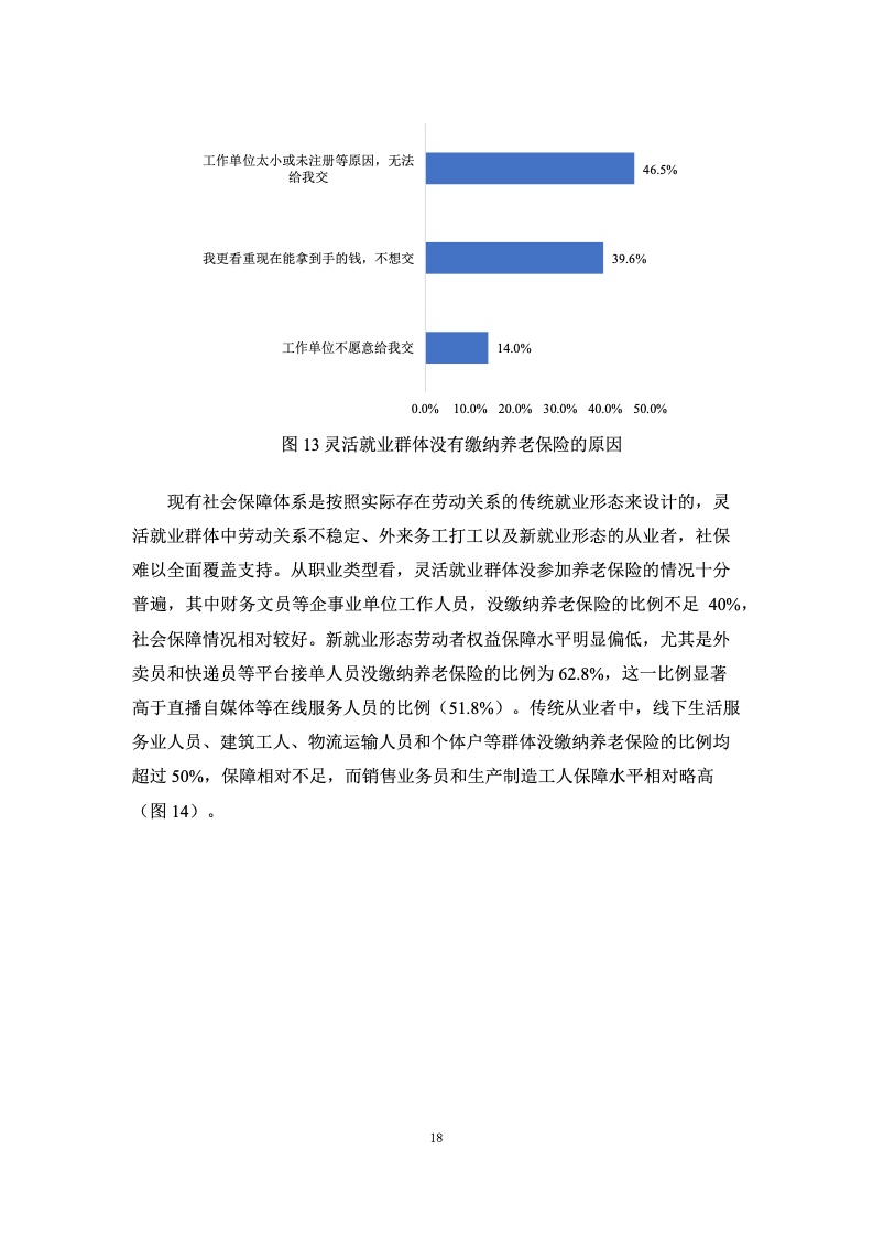 报告显示,40.5%的灵活就业人员没有劳动合同或仅有一年内的临时合同。同时,由于灵活就业的不稳定性,劳动者无法有效积累工作记录,难以认证工作技能,导致职业成长缺乏系统性。