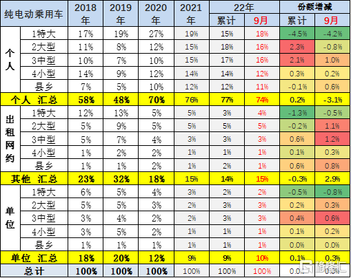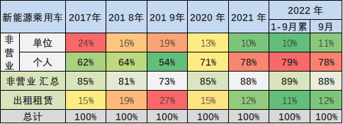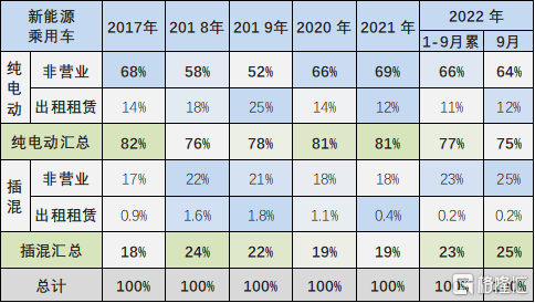 2017-2019 年新能源乘用车的出租租赁类占比逐步提升,随后 2020 年开始的纯电动出租租赁的占比持续下降。由于私人市场供给不足,纯电动 2022 年 9 月出租租赁的占比在 12%,较年初提升较大。