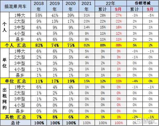 插电混动车型的单位用车和出租占比持续萎缩。插混出租租赁车型主要的需求在特大城市和大型城市市场,今年的特大型城市插混出租大幅萎缩。