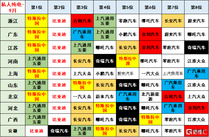 私人纯电动市场的特色相对鲜明,高端化趋势极其明显。比亚迪表现优秀,发达地区基本都是第一。广西与山东的上汽通用五菱较强。