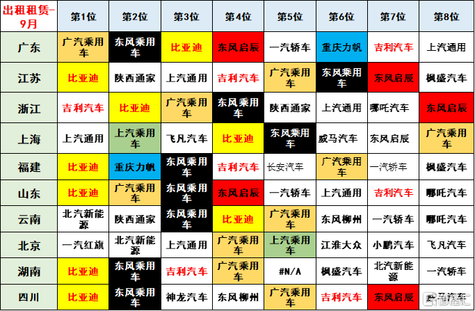 各地出租市场的表现相对差异化较大。今年 9 月表现较强的出租市场是广东、浙江、江苏等。其中各个厂家在各地的出租市场表现也是差异较大。有些地区的本地产品在本地出租市场的占有率并不一定很高,比如四川市场,还有重庆市场今年都是外地品牌表现相对优秀。