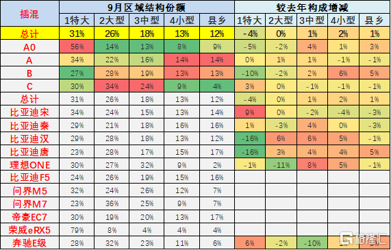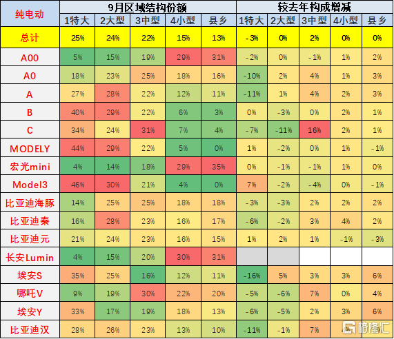 从主力车型的表现来看,也是体现了主力车型在大中城市的表现改善。尤其是 9 月以比亚迪为代表的增量,相比较同期的份额增量是大城市和中型市场增长 2 个百分点。从特斯拉来看, 9 月份较同期的的主力区域更延伸到小型城市,中型城市的纯电动市场增长相对较好。