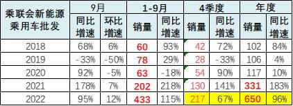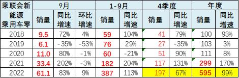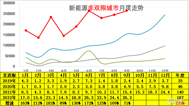 2022 年新能源车在非双限城市的表现极其优秀, 9 月份销售 26.3 万台,同比增速 71%。总体来看,1-9 月份累计达到 187 万台水平,同比增长 129%,呈现了强势增长特征。