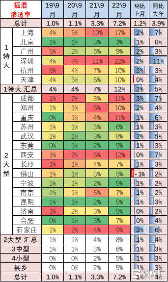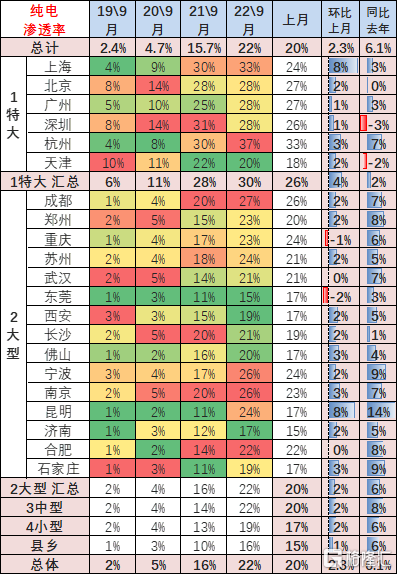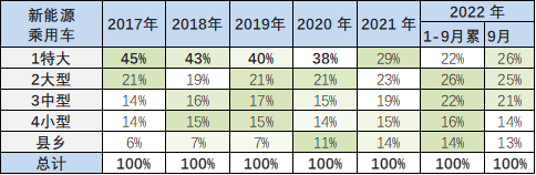 新能源乘用车前几年主要在限购特大城市需求较强,近期持续下行。2022 年 1-9 月新能源乘用车在特大城市占到总销量 22%,较 2021 年下降 7 个百分点,这也是说明限购城市的新能源车市场销量逐步增速放缓,基础的人口规模对需求有约束。由于人口基数大,公共交通差,近期的县乡市场新能源逐步启动。
