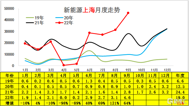 2022 年 9 月份上海的新能源车市场销量达到不足 4.6 万台,相对去年 9 月的 2.8 万提升不大,9 月的上海新能源车遭遇疫情的损失未来应该能明显恢复。