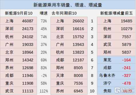 2022 年 1-9 月新能源车相对于 2021 年同期全面大幅增长,成都、杭州、佛山、深圳等增长都相对较为迅猛,尤其成都的增量达到 6 万台的规模,形成增量的核心推动力量。