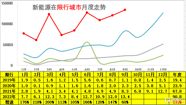 新能源车在限行城市的表现相对较强,2022 年 9 月份又达到 13.4 万台水平,同比增长速度达 60%。而且 1-9 月份累计的新能源车的销量达到 90.8 万台的水平,同比增长 131%,远高于我们总体的车市增长,也高于我们总体新能源车的平均增长速度,体现了限行城市在疫情之下购买新能源车的热情相对较高。