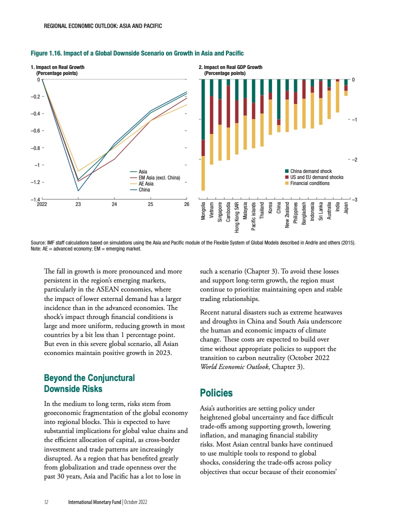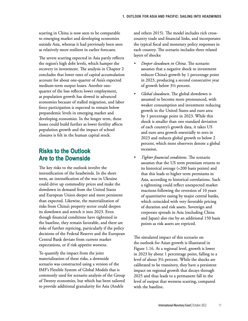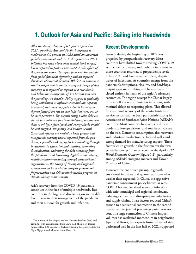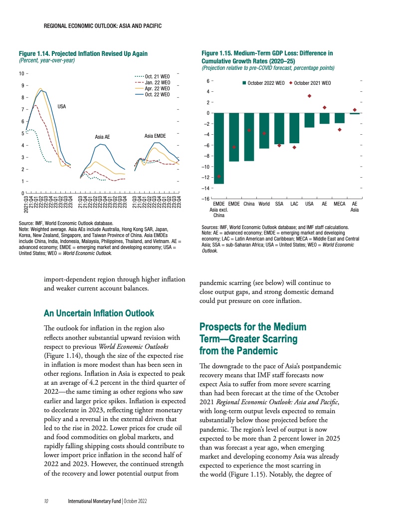 “充满挑战的形势正在加剧新冠疫情带来的中期经济创伤。与疫情前的预测相比,疫情预计将导致产出长期下降,并且这种长期创伤效应在亚太地区将最为严重。相对于其他地区,亚洲经济增长不足在很大程度上可以归因于疫情后投资水平的下降。这些产出损失在依赖旅游业的经济体和高债务国极为严重。