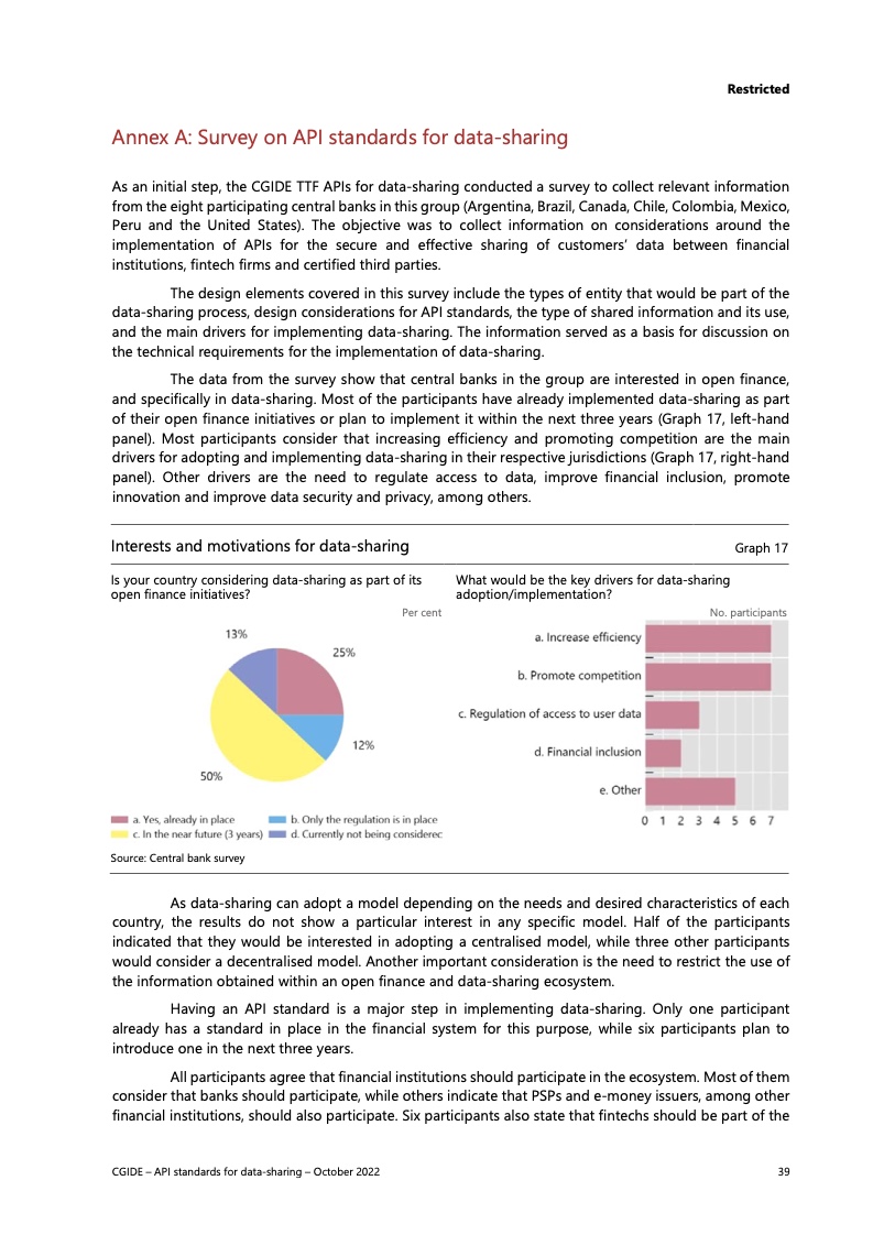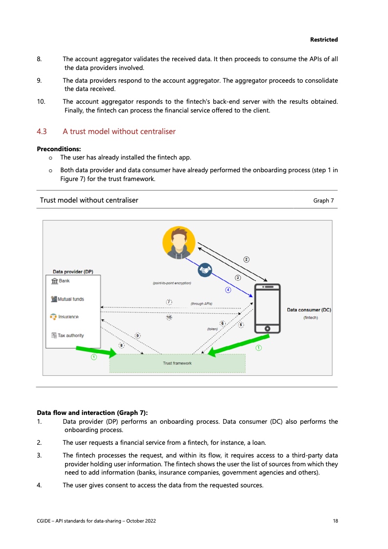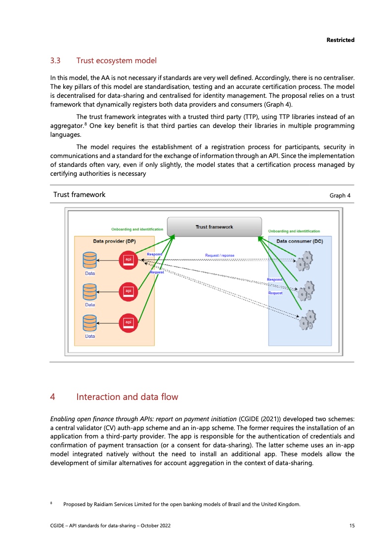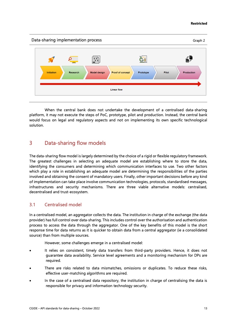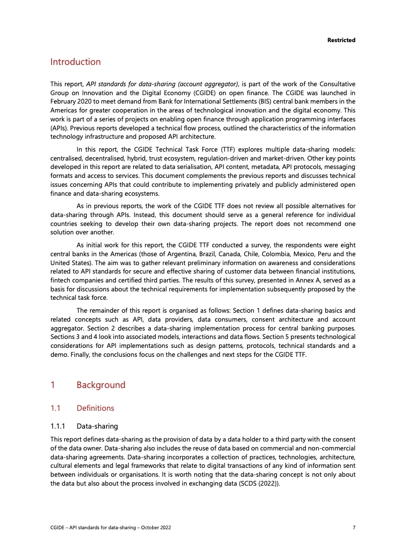 这份报告也是国际清算银行创新和数字经济咨询小组(CGIDE)主导的通过API实现开放金融三部曲的第三部分。对CGIDE中央银行成员的调查显示,各方在实施数据共享以提高效率和促进合作方面存在共同利益,而目前主要的挑战在于参与者之间的协调、标准化和技术基础设施。报告提出了集中、去中心化和托管三种数据共享模式,并开发了用户交互及数据流。