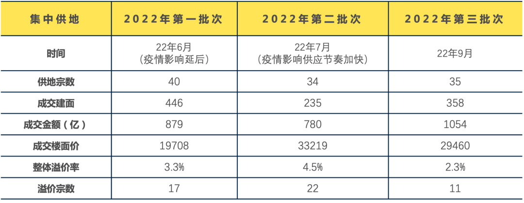 受疫情影响,22年集中供地节奏较21年明显提升,自6月一批次土拍结束后,7月二批成交,9月三批次成交,在如此高频大批量推售节奏下,三批次热度有所下降。三批次集中供应涉宅用地35幅,计容建面358万方,总成交金额1054亿(含4幅城中村地块),0流拍,平均溢价率2.3%,为集中供地以来新低。