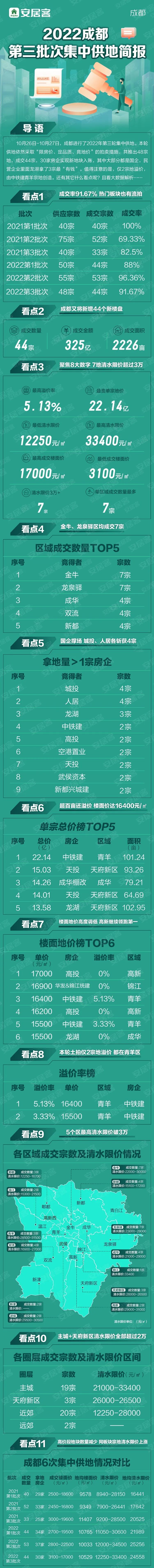 10月26日-10月27日,成都进行了2022年第三轮集中供地。本轮供地依然采取“限房价、定品质、竞地价”的拍卖措施,共推出48宗地,成交44宗,30家房企实现新地块入账,其中大部分都是国企,民营企业里面龙湖拿了3宗最“有钱”。值得注意的是,仅2宗地溢价,由中铁建青羊宗地创造。还有其它什么看点呢?且看大数据解析……