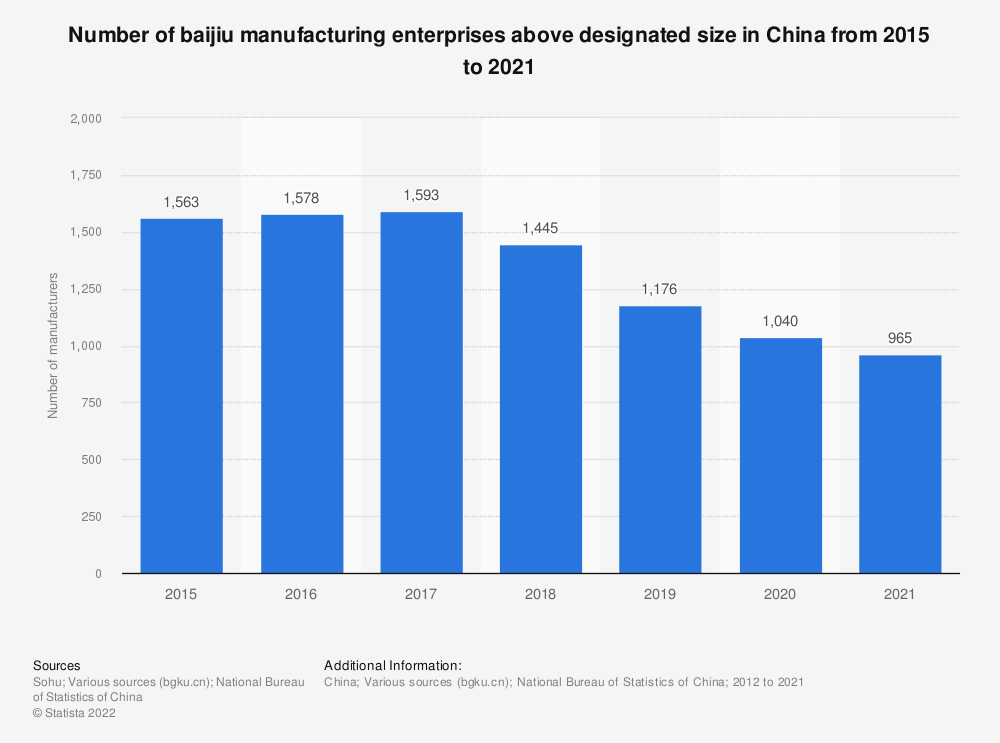 截至2021年底,中国共有965家规模以上白酒生产企业,比2020年底的1040家有所减少。自2017年以来,随着行业集中度的提高,白酒生产企业的数量有所下降。