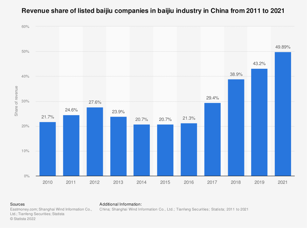 2011-2021年中国白酒行业上市白酒公司收入占比 数据来源:Statista.com