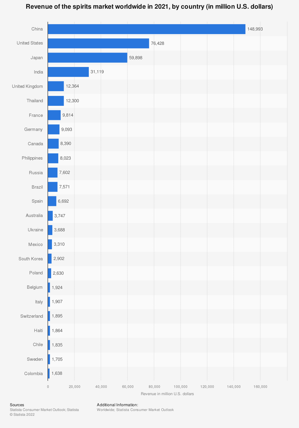 2021年全球烈酒市场收入,各国(百万美元) 数据来源:Statista.com