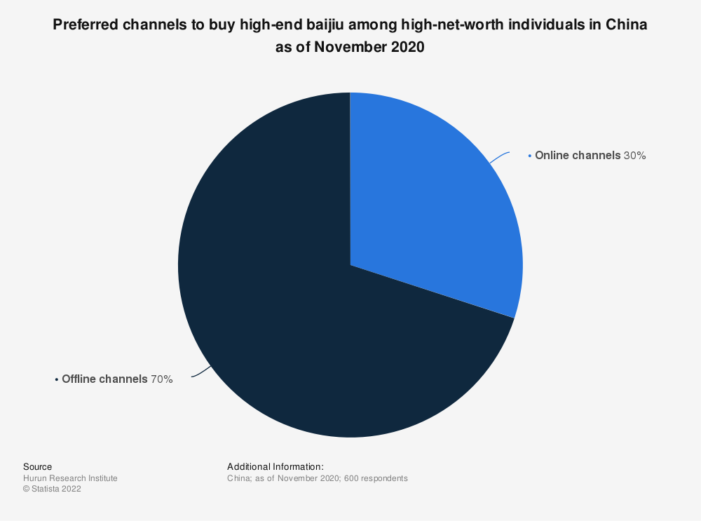 虽然电子商务在中国拥有很高的渗透率,但十个较富裕的消费者中,有七个人喜欢在线下购买白酒,因为那里的质量更有保障。线下购买白酒最受欢迎的主要渠道是品牌专营店和百货商店。