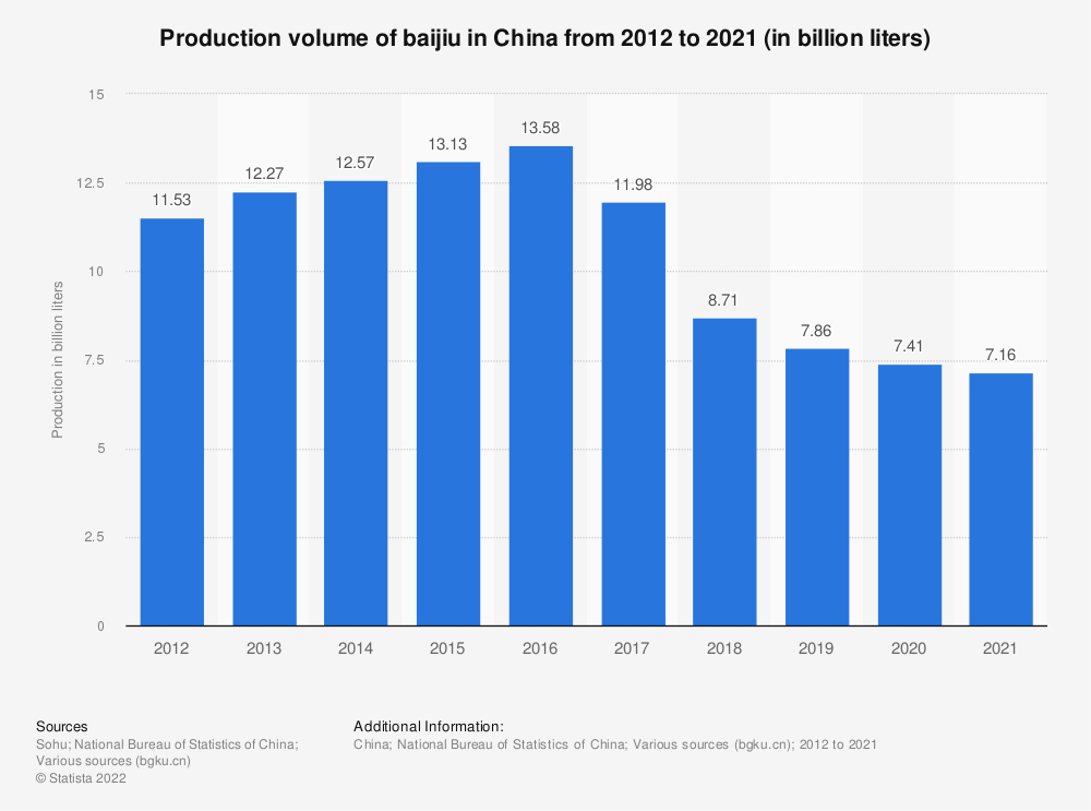 2021年,中国的白酒产量约为71.6亿升,比前一年的74.1亿升有所下降。自2016年生产企业数量减少以来,中国的白酒生产量持续下降。