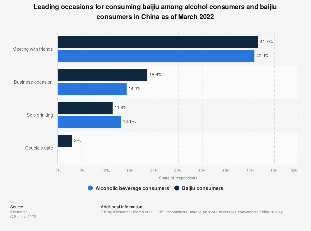根据2022年在中国进行的一项调查,约41%的受访饮酒者表示,他们最后一次喝白酒是在朋友聚会上。与此同时,约四分之一接受调查的白酒消费者表示,他们最近是在与家人见面时喝白酒。