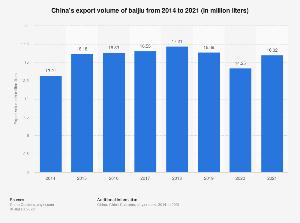 2021年,中国出口了约1602万升白酒,高于前一年的约1425万升。当年的出口总额约为5.648亿美元。