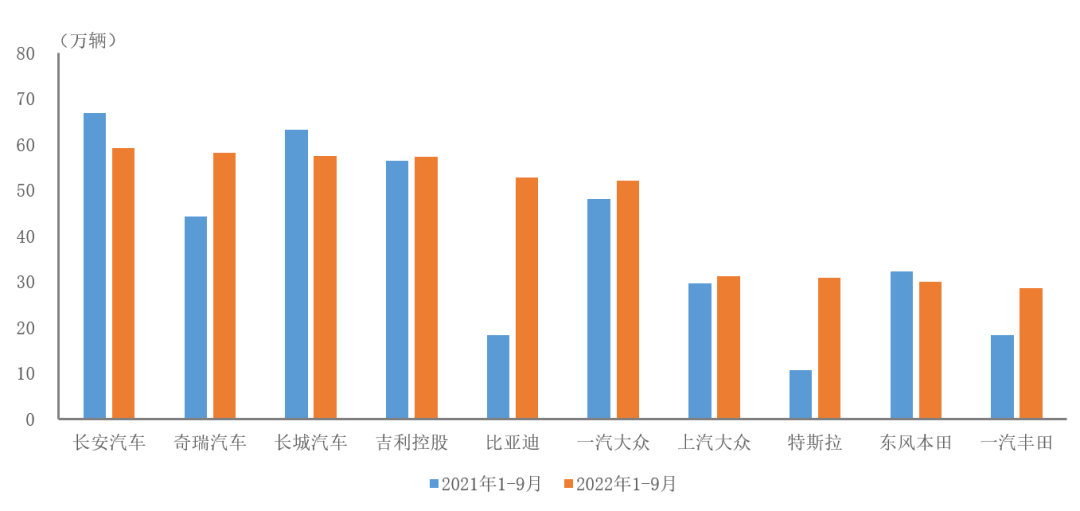 中国汽车工业协会:2022年1-9月前十家SUV生产企业销售情况简析 据中国汽车工业协会统计分析,2022年1-9月,销量排名前十位的SUV生产企业共销售457.3万辆,占SUV销售总量的56.9%。 在上述十位企业中,与上年同期相比,长安汽车、长城汽车、东风本田销量有所下降,其他企业均呈增长,其中比亚迪、特斯拉增速更为明显。 更多阅读:中国汽车工业协会:2023年1月前十家SUV生产企业销售情况简析中国汽车工业协会:2023年1-2月前十家SUV生产企业销售情况简析中国汽车工业协会:2022年1-8月销量排名前十位的SUV生产企业共销售395.2万辆中国汽车工业协会:2022年1-11月销量排名前十位的SUV生产企业共销售580.2万辆中国汽车工业协会:2022年1-5月前十家SUV生产企业销售情况简析中国汽车工业协会:2022年1-4月前十家SUV生产企业销量情况简析中国汽车工业协会:2023年1-3月前十位SUV生产企业销售情况简析中国汽车工业协会:2024年1-6月前十位SUV生产企业销售情况简析中国汽车工业协会:2023年1-2月我国汽车商品出口金额前十国情况简析中国汽车工业协会:2022年3月前十位轿车品牌销量排名中国汽车工业协会:2021年5月汽车工业运行情况简述中汽协:2024年1-4月前十位SUV生产企业销售情况简析中汽协:2024年1-5月前十位SUV生产企业销售情况简析中汽协:2021年上半年销量前十SUV生产企业简析中国汽车工业协会:2023年1-8月汽车制造业工业增加值保持较快增长
