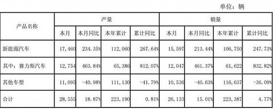 近日,赛力斯集团发布公告称,其 10 月新能源汽车销量达 15597 辆,同比增长 213.44%;其中赛力斯汽车 10 月销量 12047 辆,同比增长 461.37%;本年累计销量 61622 辆,同比增长 832.82%。