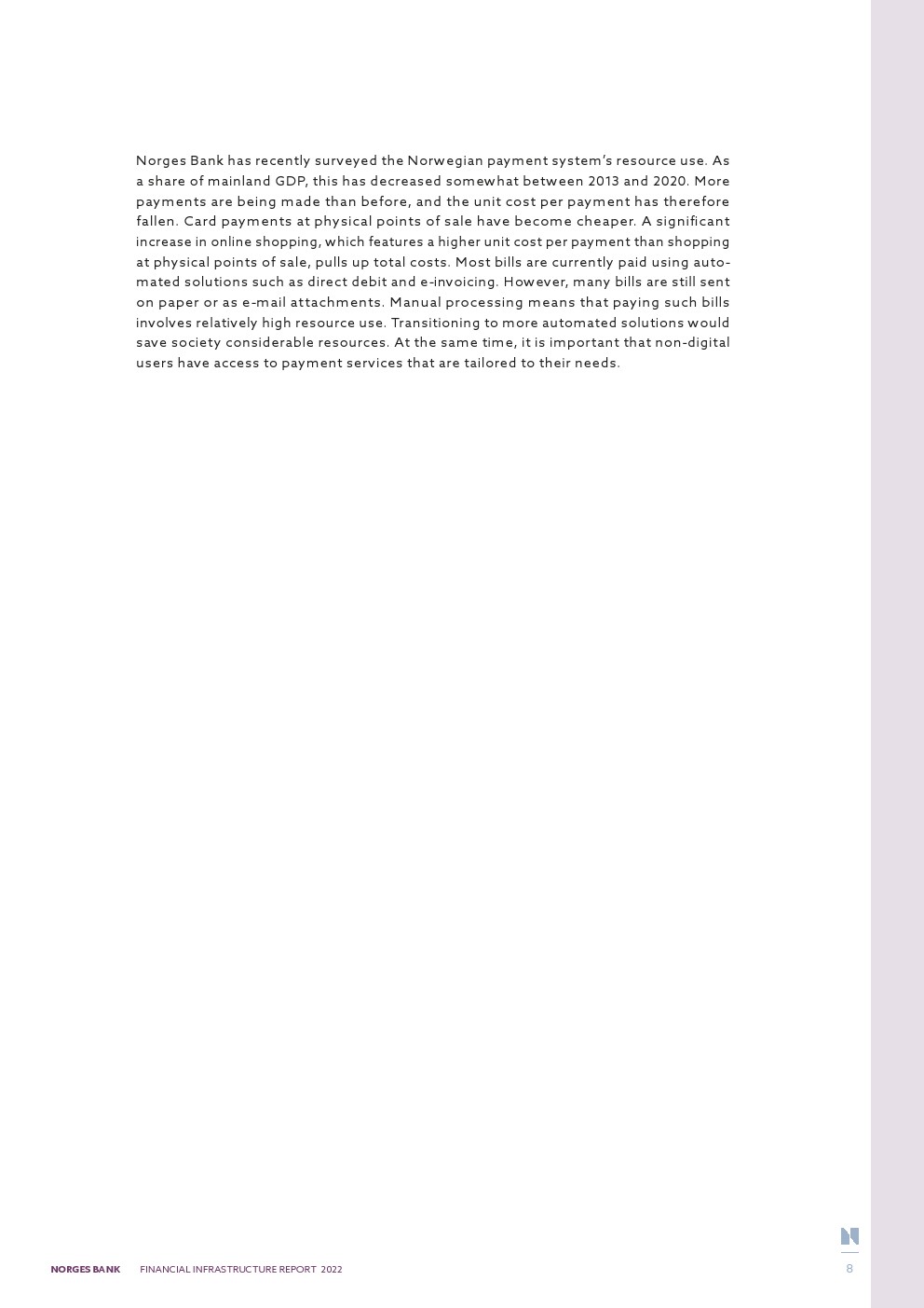 挪威支付系统长期以来一直以标准化和用户友好的解决方案为特色,近年来金融市场基础设施(FMI)的运行也很稳定。挪威银行认为金融基础设施安全高效。2013-2020年期间,支付系统的资源使用有所减少,与其他国家相比似乎偏低。