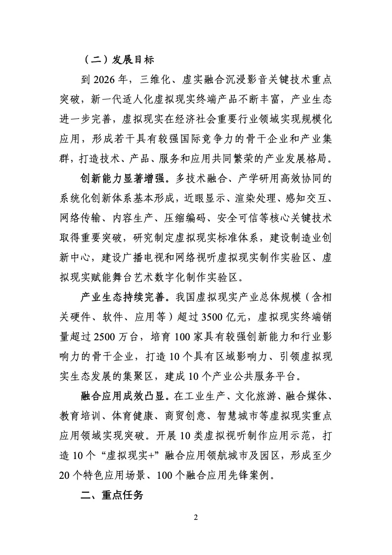 《行动计划》设立的发展目标为,到2026年,三维化、虚实融合沉浸影音关键技术重点突破,新一代适人化虚拟现实终端产品不断丰富,产业生态进一步完善,虚拟现实在经济社会重要行业领域实现规模化应用,形成若干具有较强国际竞争力的骨干企业和产业集群,打造技术、产品、服务和应用共同繁荣的产业发展格局。