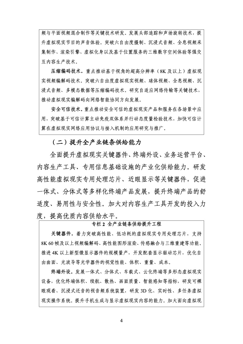 《行动计划》指出,虚拟现实(含增强现实、混合现实)是新一代信息技术的重要前沿方向,是数字经济的重大前瞻领域。我国虚拟现实产业初步构建了以技术创新为基础的生态体系,正迈入以产品升级和融合应用为主线的战略窗口期。
