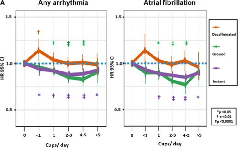 对心律失常的分析发现,现磨咖啡和速溶咖啡与降低心律失常风险有关。与不喝咖啡的人相比,每天饮用4-5杯现磨咖啡,2-3杯速溶咖啡的人心律失常风险最低,分别降低了17%和12%。但在饮用不含咖啡因咖啡的人中没有发现类似益处。