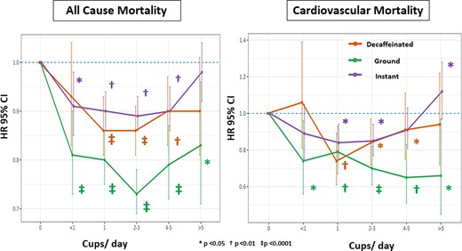 咖啡亚型摄入量和死亡风险。(图片来源:European Journal of Preventive Cardiology)
