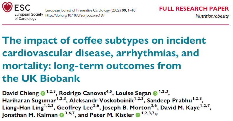 [1] David Chieng, Rodrigo Canovas, Louise Segan, Hariharan Sugumar, Aleksandr Voskoboinik, Sandeep Prabhu, Liang Han Ling, Geoffrey Lee, Joseph B Morton, David M Kaye, Jonathan M Kalman, Peter M Kistler, The impact of coffee subtypes on incident cardiovascular disease, arrhythmias, and mortality: long-term outcomes from the UK Biobank, European Journal of Preventive Cardiology, 2022;, zwac189, https://doi.org/10.1093/eurjpc/zwac189.
