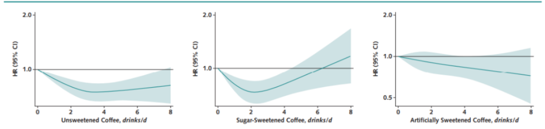 无独有偶,近期南方医科大学的学者们在Annals of Internal Medicine发表了一篇题为” Association of Sugar-Sweetened,Artificially Sweetened,and Unsweetened Coffee Consumption With All-Cause and Cause-Specific Mortality “的研究论文。他们发现,无糖咖啡和有糖咖啡的饮用量与全因死亡率呈U型相关。与不喝咖啡的人相比,每天喝1.5-3.5杯咖啡,无论无糖或加糖,都可以将全因死亡风险降低28-31%!