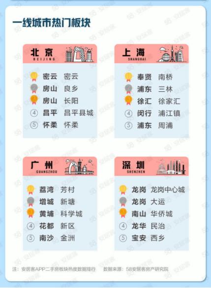 热门板块方面,北京密云、良乡、长阳、昌平县城和怀柔;上海南桥、三林、徐家汇、浦江镇和周浦;广州芳村、新塘、科学城、新区和金洲以及深圳龙岗中心城、大运、华侨城、民治和西乡均备受购房者的青睐。