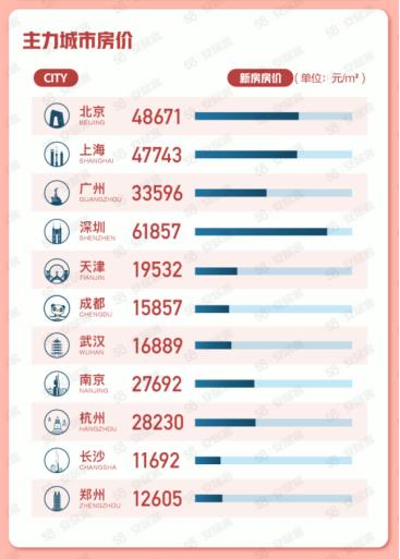 从主力城市的新房线上均价来看,一线城市中,深圳新房线上均价为 61857 元 /㎡,北京为 48671 元 /㎡,上海新房为 47743 元 /㎡,广州为 33596 元 /㎡。新一线城市中,杭州新房线上均价为 28230 元 /㎡,南京为 27692 元 /㎡。