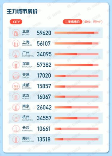 从主力城市的二手房挂牌均价来看,一线城市中,北京二手房挂牌均价为 59620 元 /㎡、深圳为 57382 元 /㎡、上海为 56107 元 /㎡、广州为 34095 元 /㎡。新一线城市中,杭州二手房挂牌均价为 34557 元 /㎡,南京二手房挂牌均价为 26042 元 /㎡。