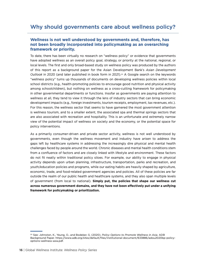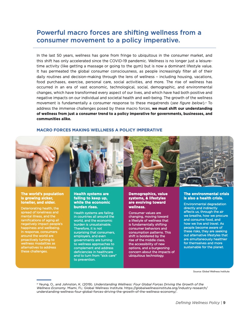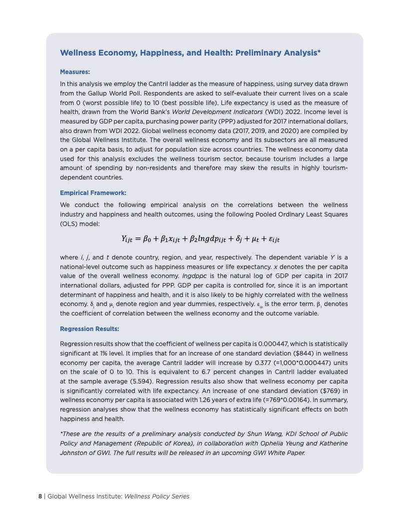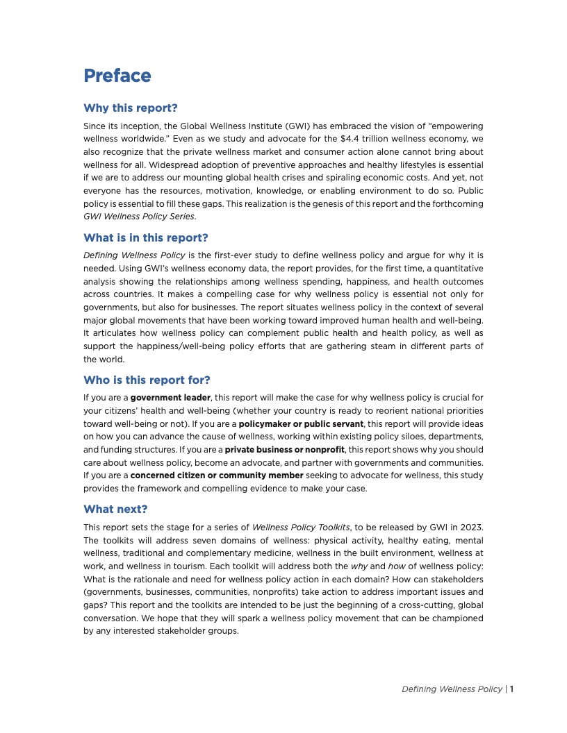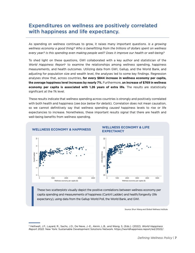 此业界首份康养政策研究报告,就各国政府着手制定康养政策之必要性与迫切性提供了有力的证据支持,并表明了以疾病护理为重点的医疗系统与无法照顾全民健康的康养企业之间,应有所调和。同时,此报告也针对各国在康养方面的支出、人民健康水平以及幸福指数首次做了定量分析,并指出了此三者之间的密切关联。