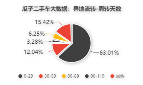 线上异地流转交易当中,二手车售卖周期也有所缩短。数据显示,8至10月线上异地流转交易平均周转天数为51.7天,较去年同期的58.6天同比缩短约12%,交易提速,周转效率大幅提升。其中,30天以内卖出占比63%,1至2个月内卖出占比15.4%,2至3个月内卖出占比6.2%,90天内卖出总占比约为85%。
