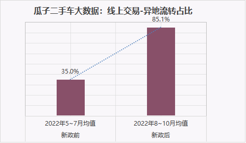瓜子二手车发布“2022二手车全国线上大流通趋势报告”显示,线上二手车交易中,异地交易已经从8月前的占比35%攀升至当前的85%以上,交易量提升超1.4倍,成为绝对主流。