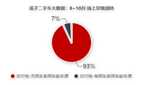 本地缺乏心仪车源,是消费者通过线上平台下单异地车源的主要原因。瓜子二手车数据显示,在8至10月线上异地流转交易中,成交车源中93%在交付地无同车系同车龄的车源,异地流转极大地解决了当地无消费者心仪车源的问题。另有7%的交付地有同车系同车龄的车源,但其中约一半的异地车源相对本地车源而言存在价格优势。