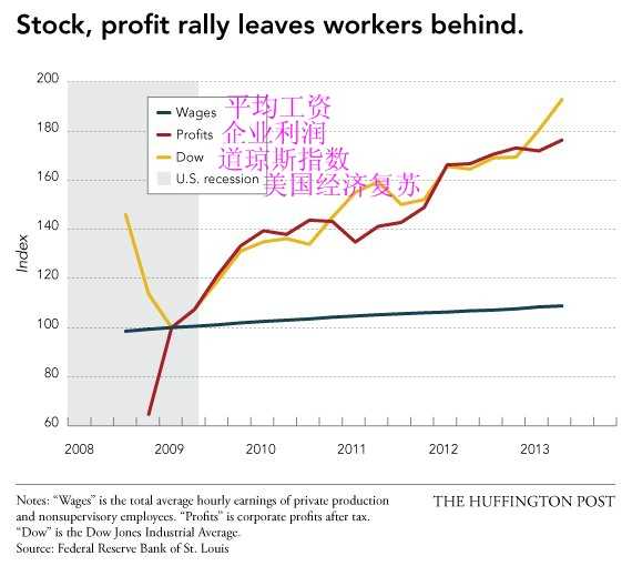 1、第一个图跟踪金融危机以来企业利润增长、道琼斯工业平均指数、工人平均每小时工资。