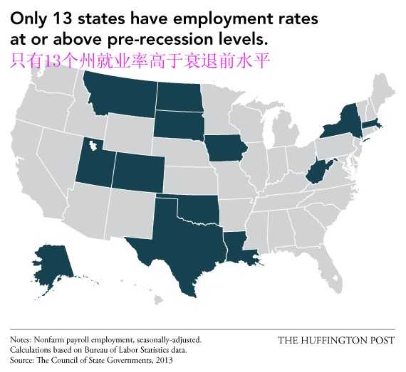 11、从地理分布上看,只有13个州就业率回到了衰退前水平。